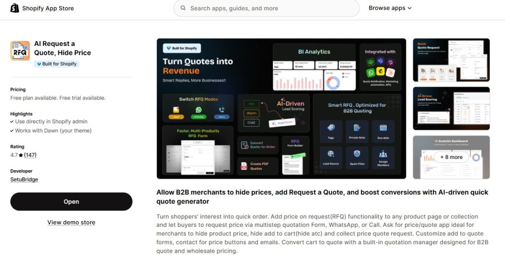 This setup works well for stores that want to hide prices or remove the Add to Cart button, especially in B2B and wholesale situations. The app also lets you customize quote forms, contact-for-price buttons, and email responses so they match your store’s style.