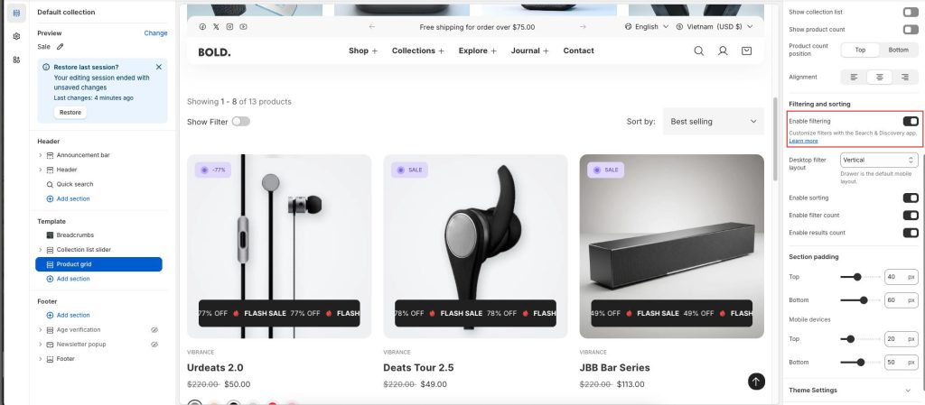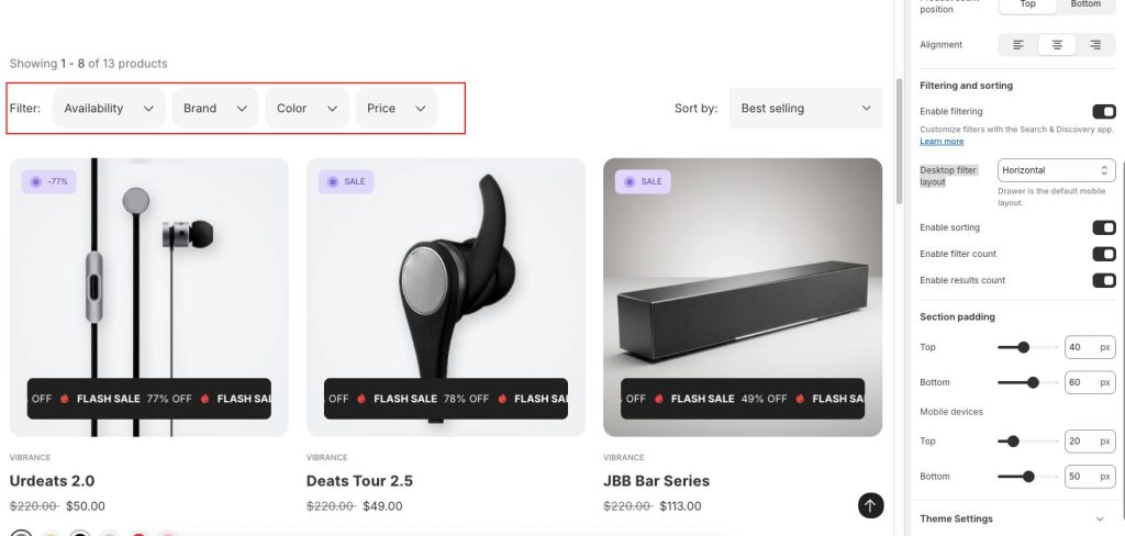 You can. Since sections are now available on all pages, including collection pages, you can enable or disable product filter options for each collection template you use. Select the Product grid section on any collection template to view the settings and enable or disable filtering.