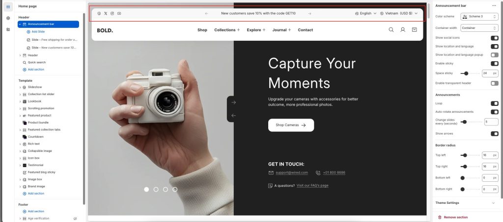 Customize the section by utilizing the settings on the right side of the theme editor: