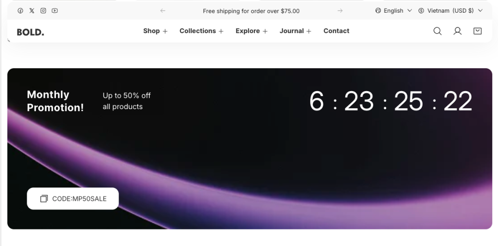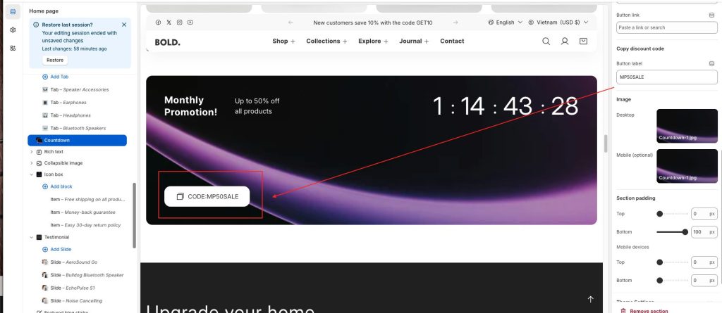 The Countdown section lets you display a timer for active promotions or special offers, clearly showing how much time remains for customers to take advantage of the deal.
