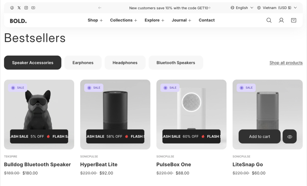 Display multiple product collections in a clean, organized layout with the Featured Collection Tabs section. Products are grouped under clickable tabs, allowing customers to switch between categories instantly without reloading the page. This setup is ideal for showcasing new arrivals, bestsellers, seasonal selections, or different product types in one seamless experience.
