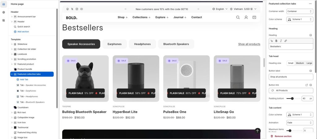 Configure your Featured Collection Tabs section: