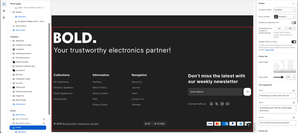 The Footer section is the final touchpoint of your website, providing essential information and navigation in a clean, accessible layout. It can include links to key pages, contact details, social media icons, newsletter sign-up, and legal disclaimers. Designed for both functionality and brand consistency, the footer helps users stay connected and informed as they explore your site.