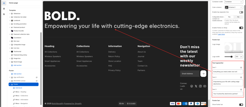 Footer blocks: This section accepts two block types: “Menu” and “Newsletter”. Using those, you can split the content in your footer area up to 5 columns. The column adjustment is automated, meaning that if you choose to add 5 blocks the resulting content will be split into 5 columns, one for each block.