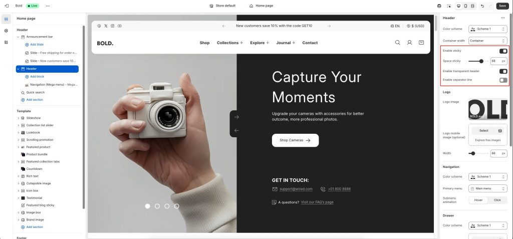 Enable sticky: Select/deselect to show/hide the sticky header. This sticky header appears when users scroll the page from bottom to top.