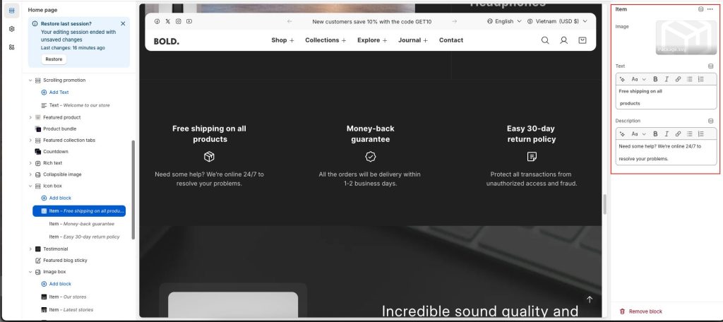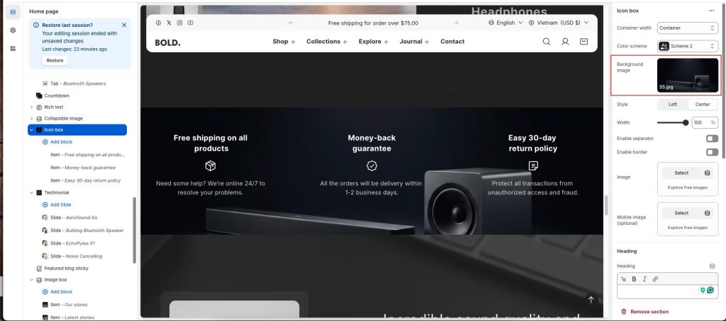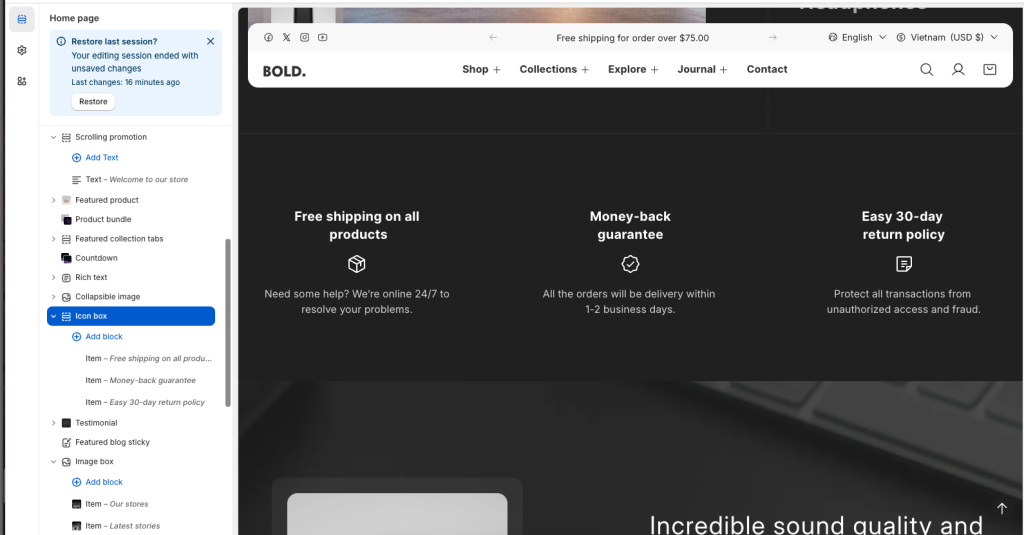 - Go to Customize theme. In the Theme editor, at the top of the page, use the dropdown to select a page that contains an Icon box section.