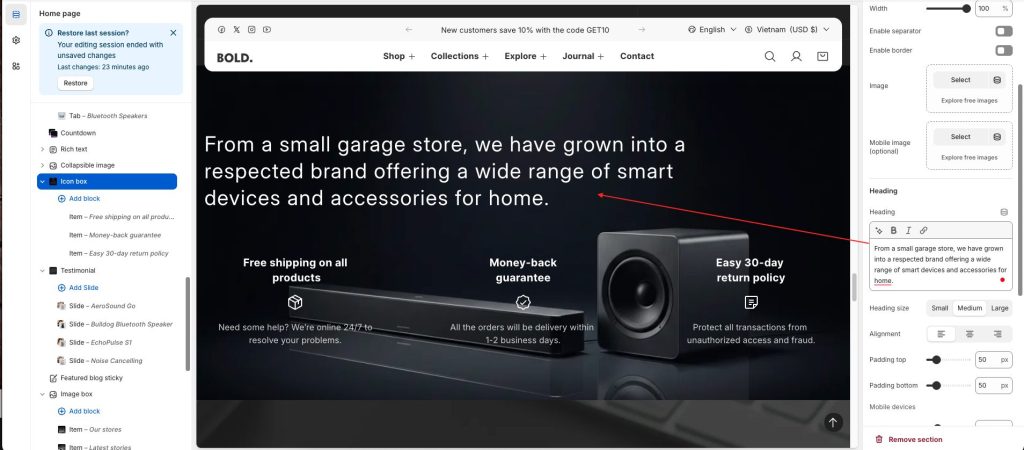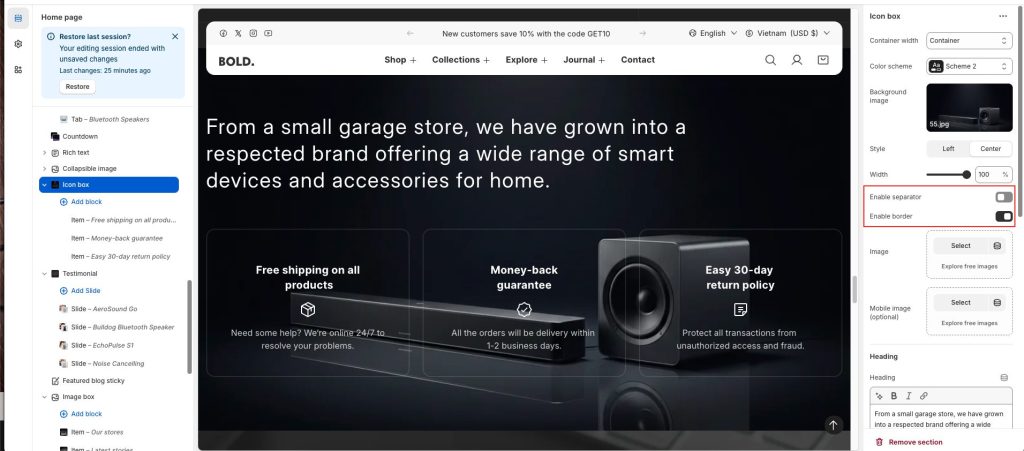 The Icon Box section displays icons paired with short descriptions to clearly communicate your store’s key messages or features. Commonly used to highlight services, offers, or important characteristics, this section helps customers quickly recognize and understand information at a glance.