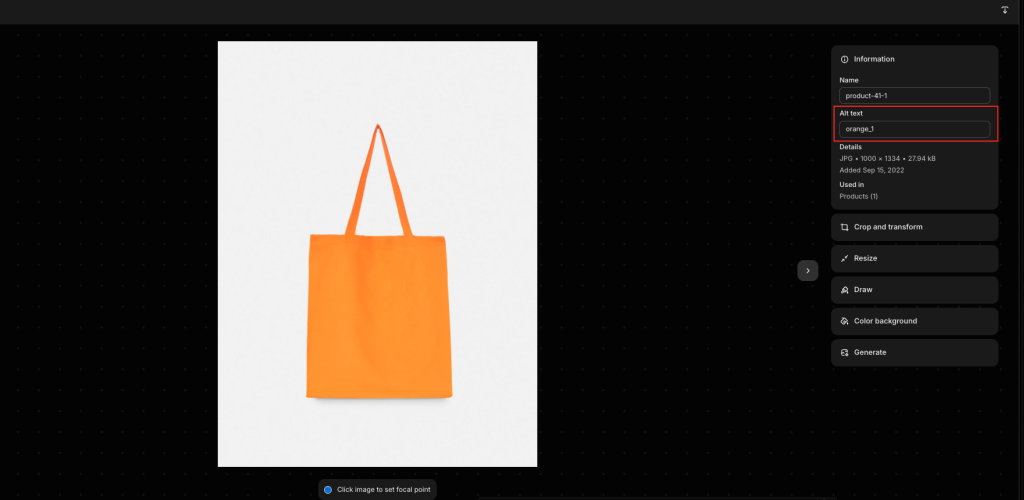 Click on an image to add Alt Text. Enter Color_” the color of your variant”.