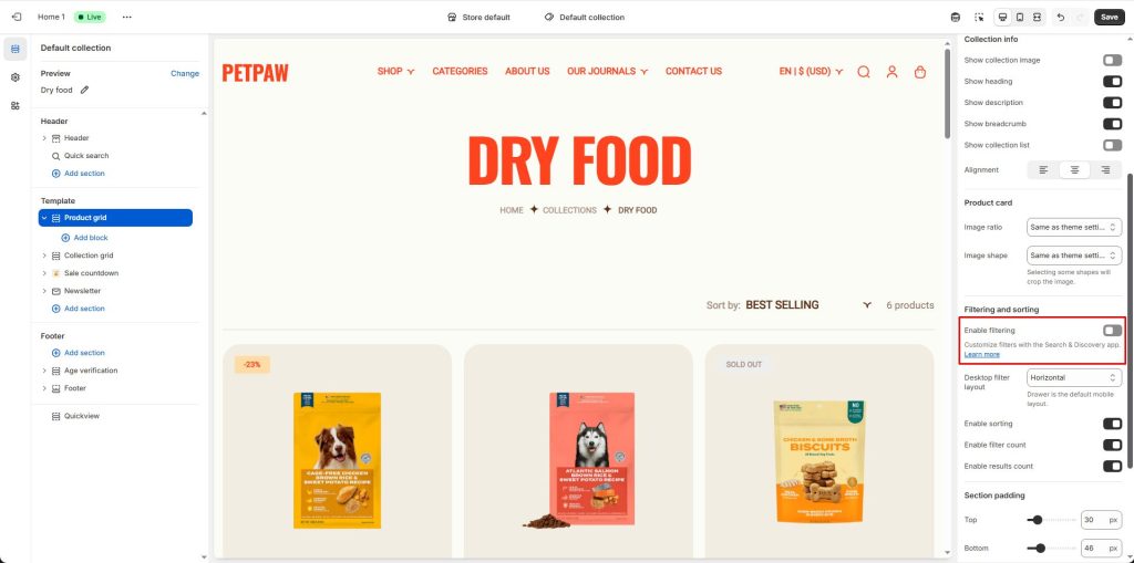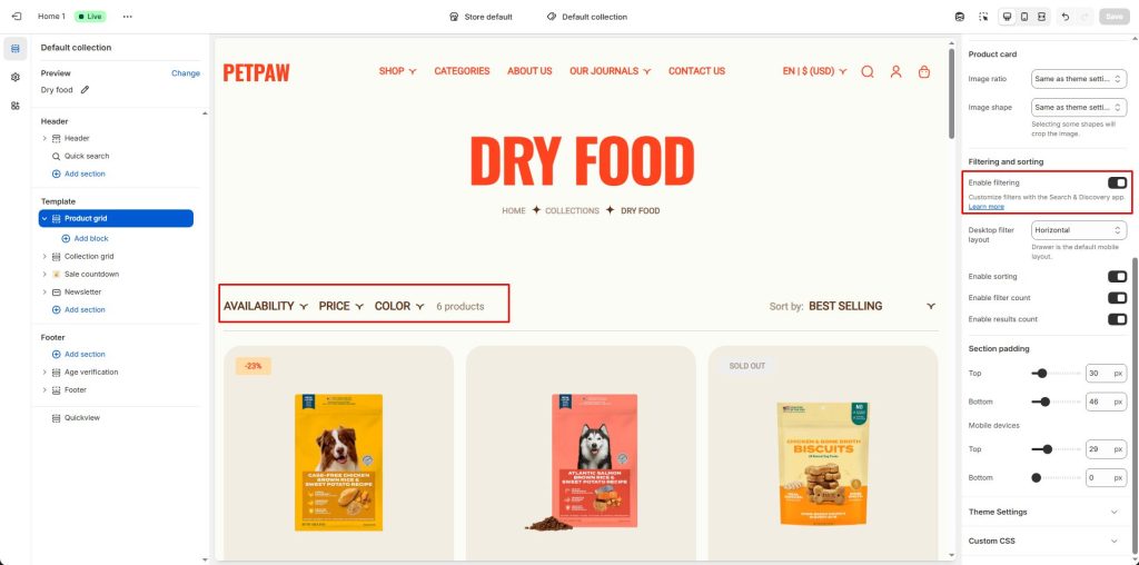 You can. Because sections are now available on all pages, including collection pages, the product filter options can be enabled or disabled for each collection template you use. Select the Product grid section on any collection template to view the settings and enable or disable filtering.