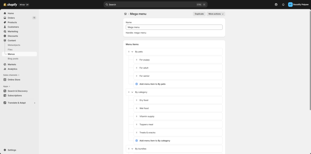 - Add parent item: item name to apply a mega navigation dropdown