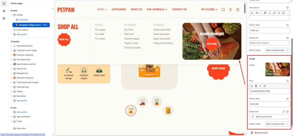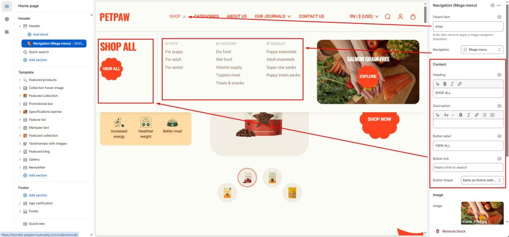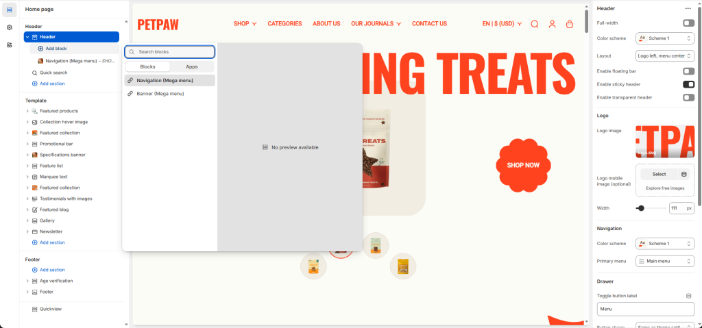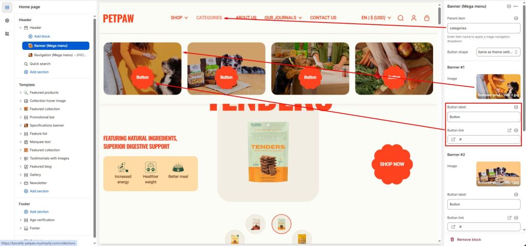 The Petpaw theme has 2 types of block to show the Mega menu: Navigation and Banner