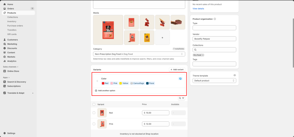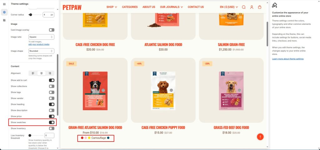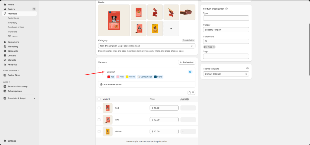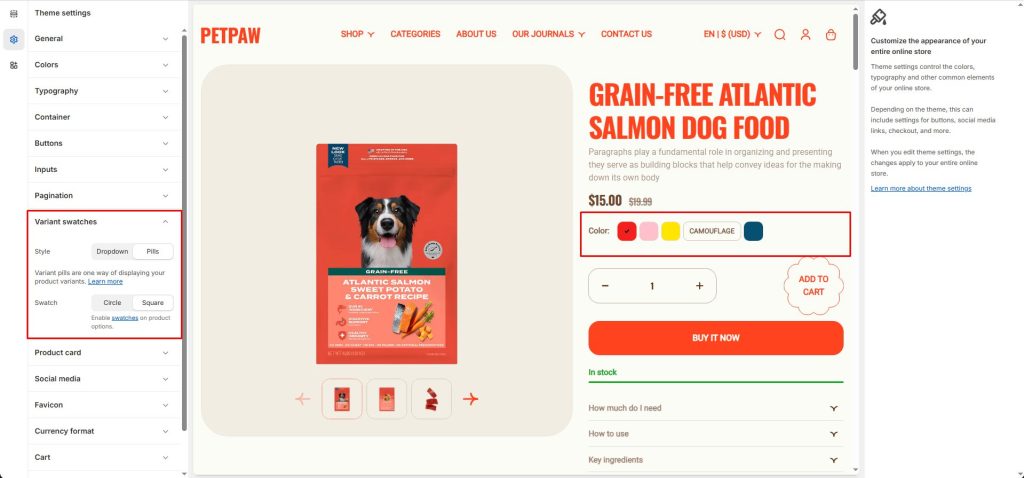 Once you have enabled the swatches settings, Petpaw will look for any variant category with the name “Color”.