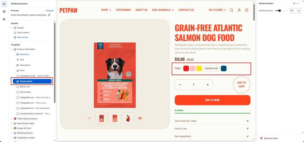 Product page active swatches by Variant picker block