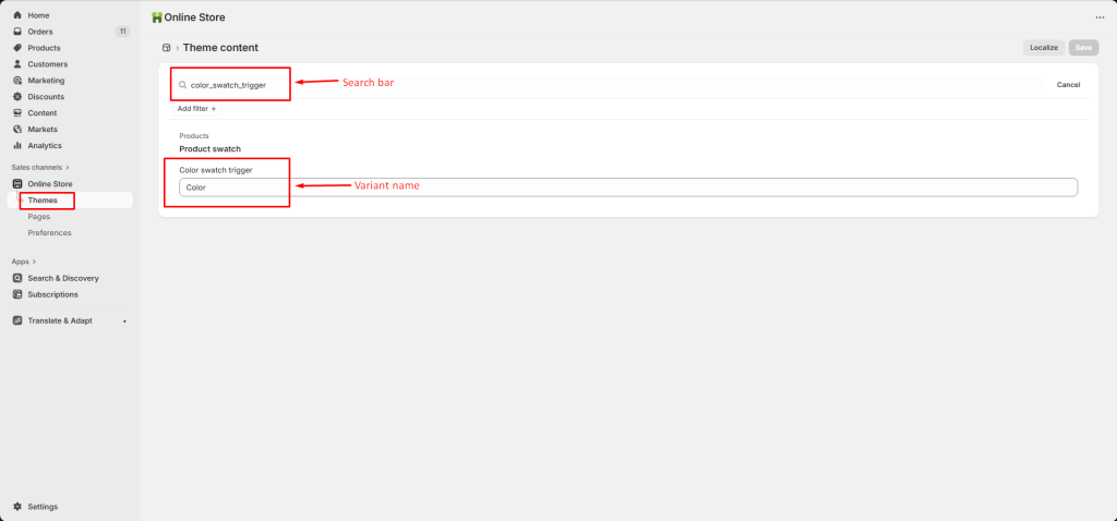 Types color_swatch_trigger in the search bar to find the [Color swatch trigger] settings.