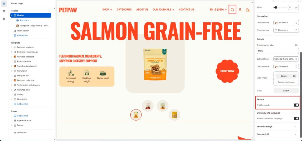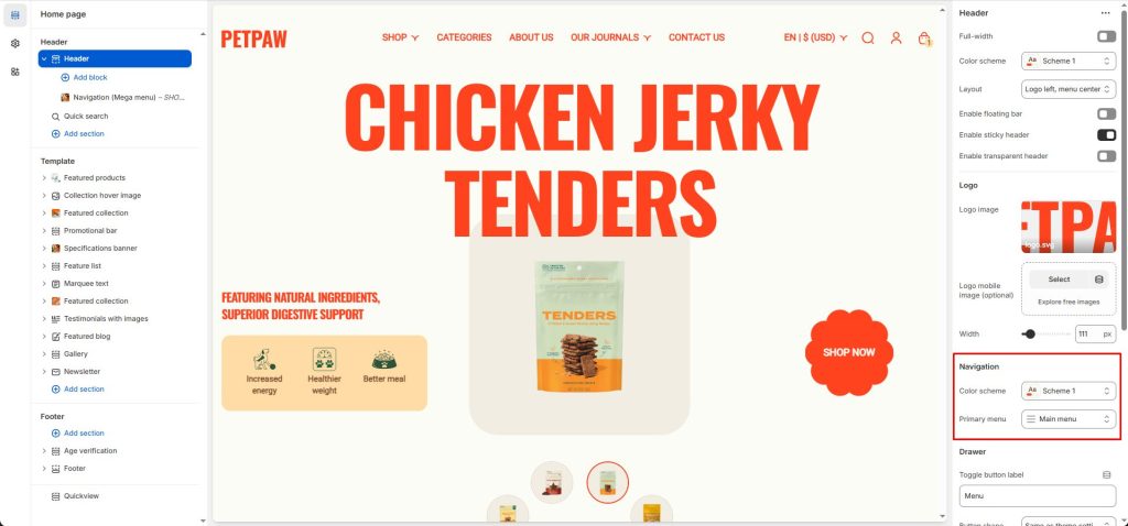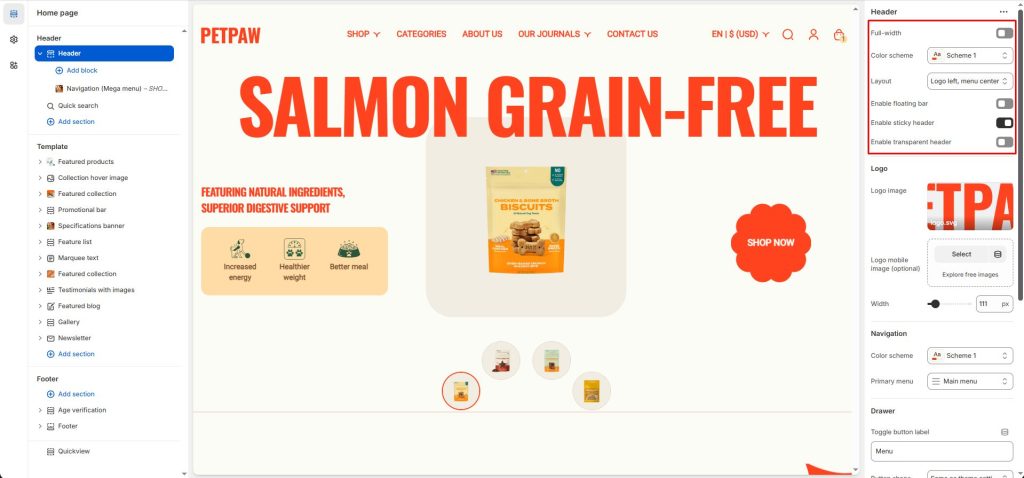 Enable Transparent Header: Enable the “Transparent Header” feature to make the header background transparent, creating a smooth effect with the background image behind.