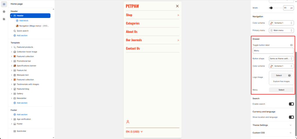 Primary menu: The main menu of your shop.