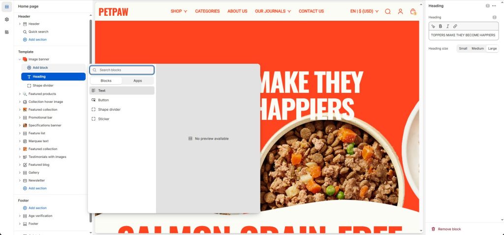 And there are also blocks that allow you to enter content such as Heading, Text, and Button.