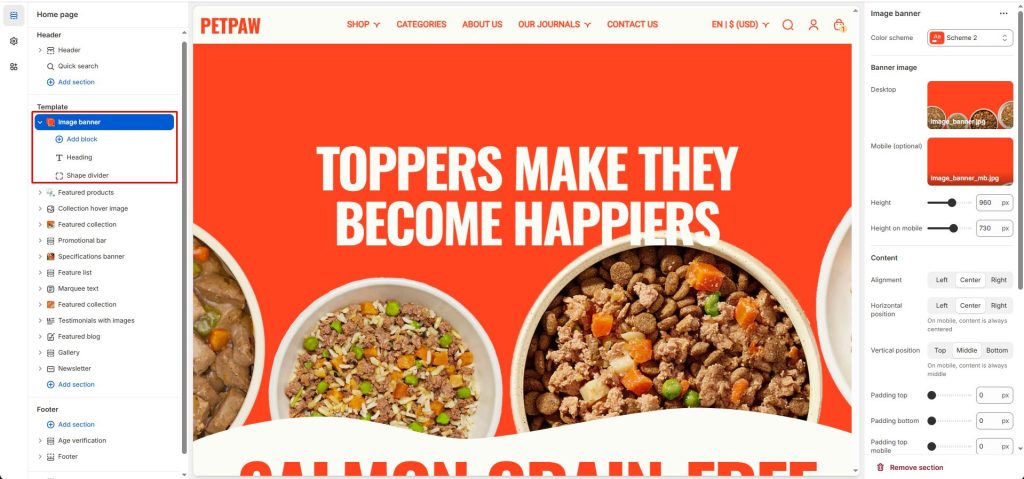 Banner image: You choose the banner image to display and set the banner height for both desktop and mobile.