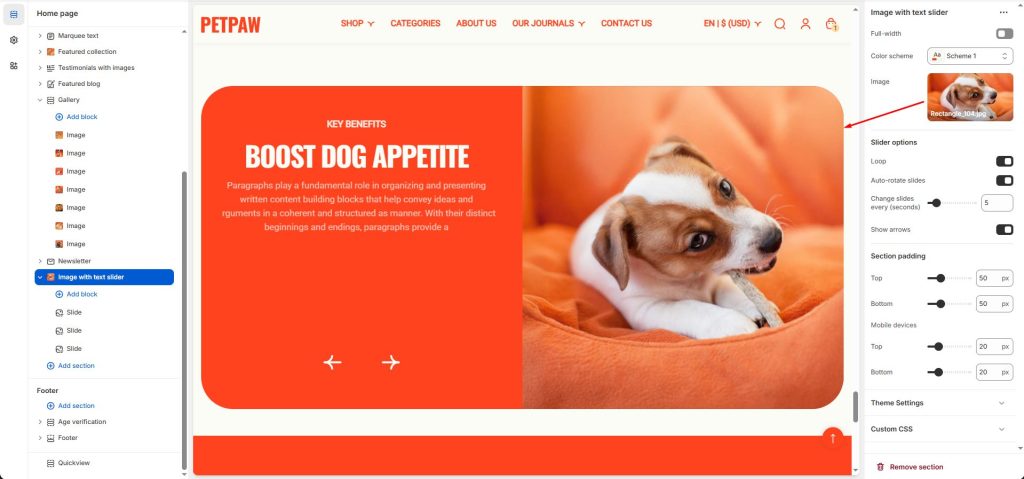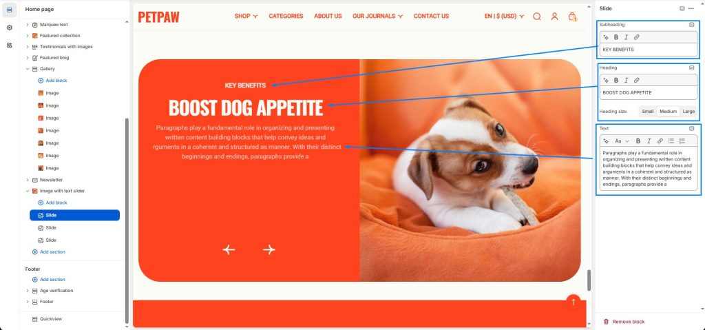 Image with text slider This section displays a fixed image and text in a slider format.Select an image to display.Customize slider options.Enter content into the Slide blocks.Doc navigation← GalleryMarquee text →