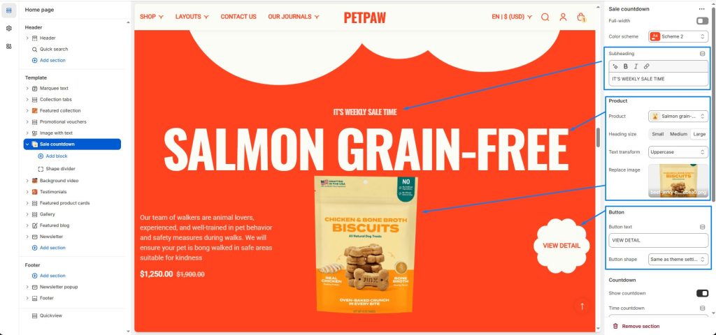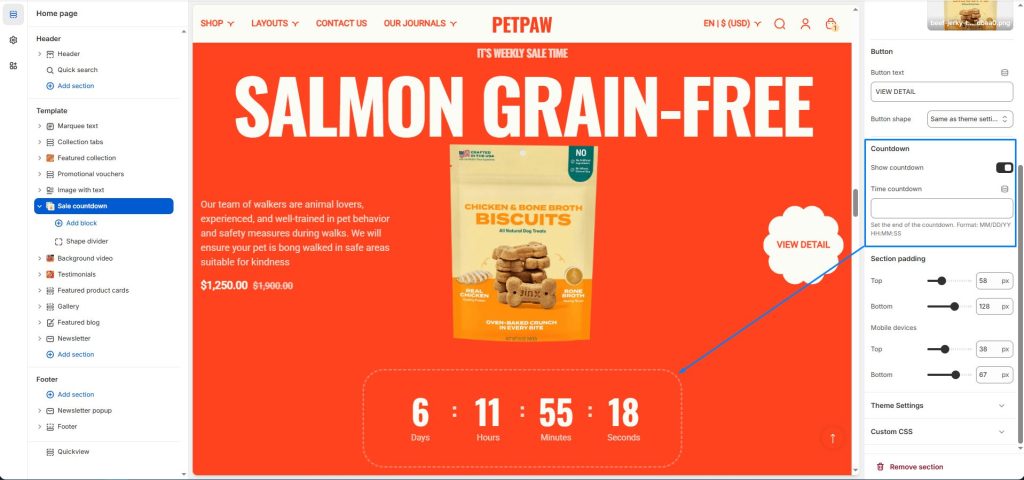 The sale countdown section allows you to display a timer for promotional products, indicating how much time is left to take advantage of that promotion.