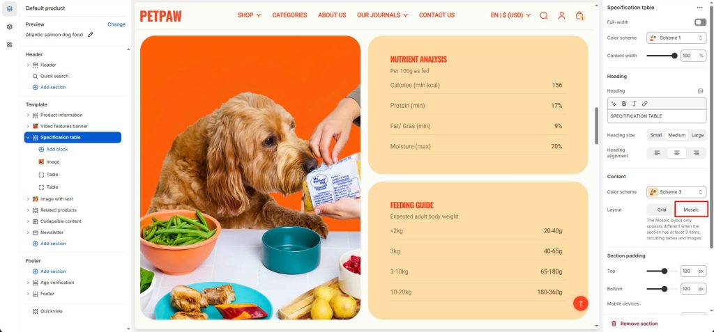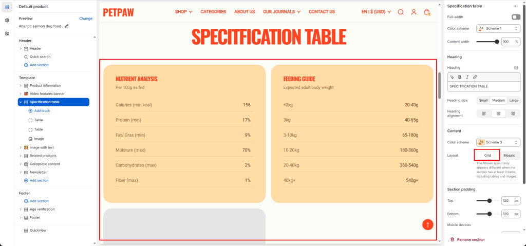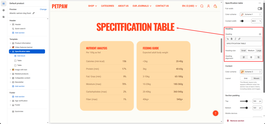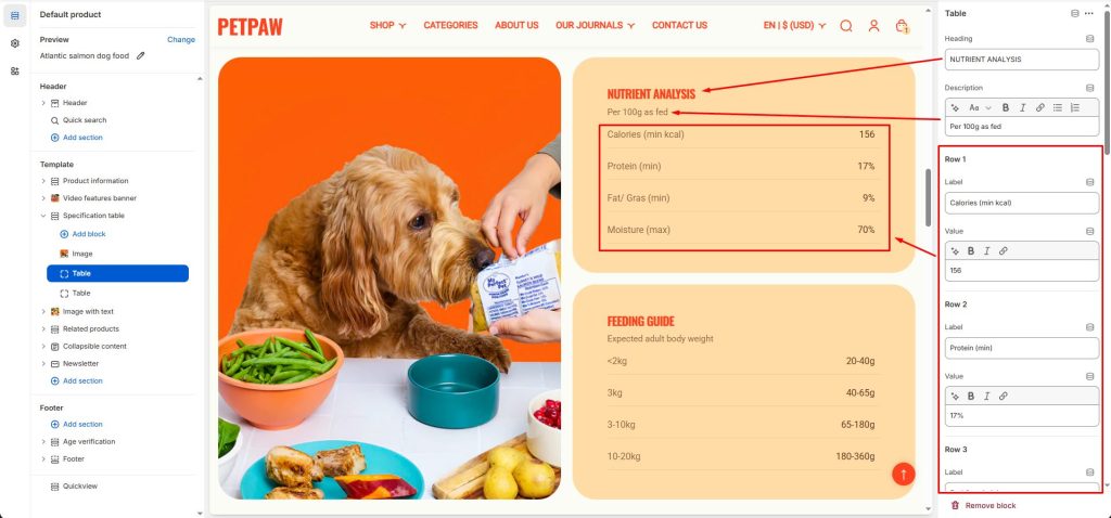 The table blocks allow you to enter heading, description, and specification values for the product.