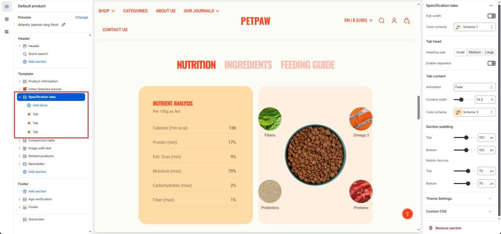 The specification tabs section allows you to display detailed specifications of a specific product in tabs.