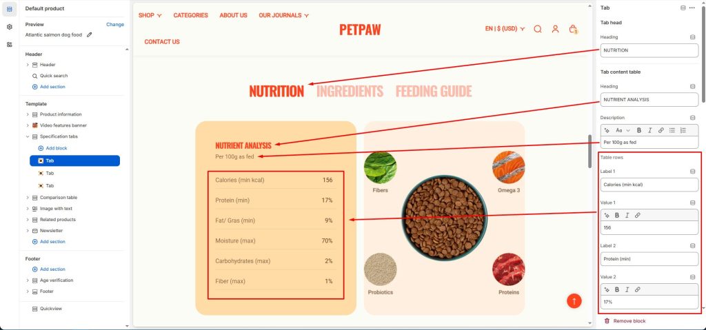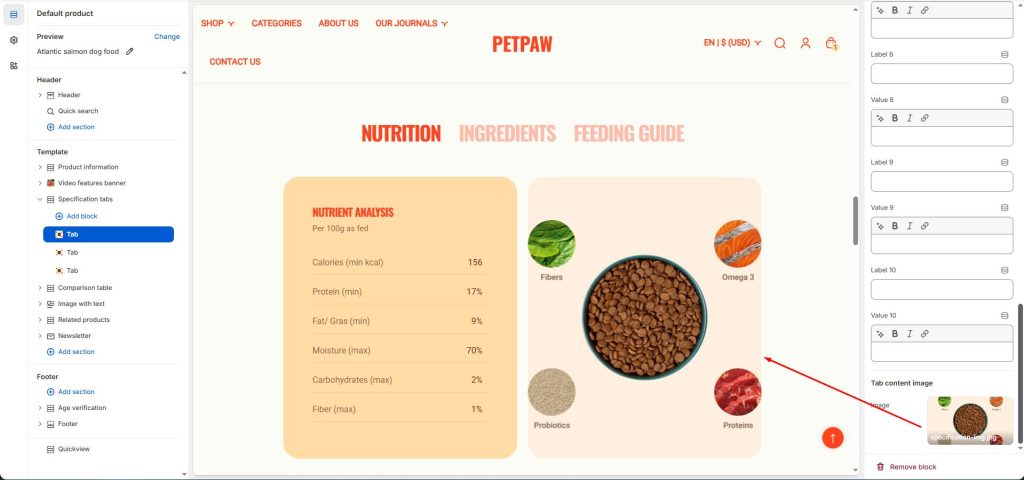 Within the tab blocks, enter the tab heading, add table specifications, and choose an image.