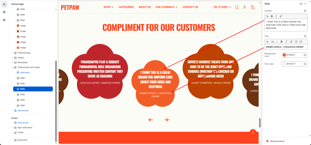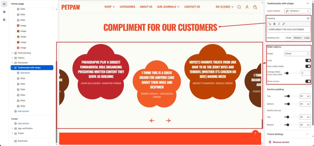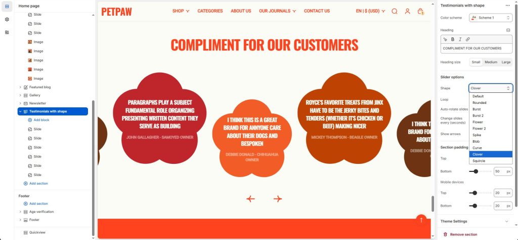 The Testimonials with Shape section showcases reviews and testimonials in distinctive and visually appealing shapes.