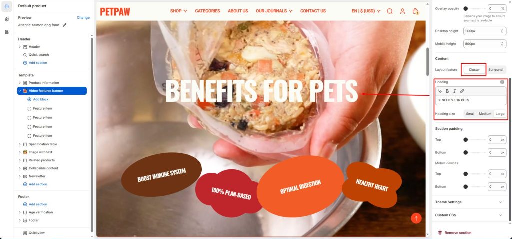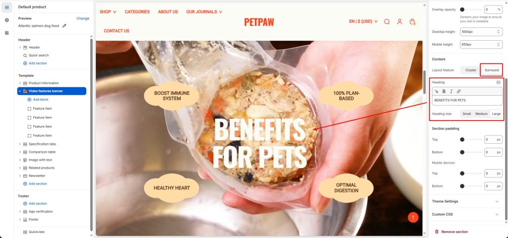 There are two layout options for the content section: Cluster and Surround.