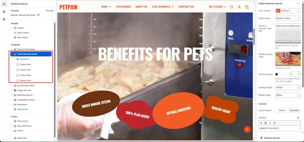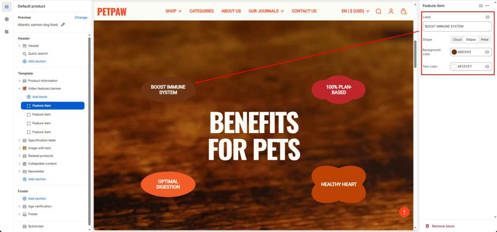 In the feature item blocks, you can enter the feature name, choose the background shape, and select colors.