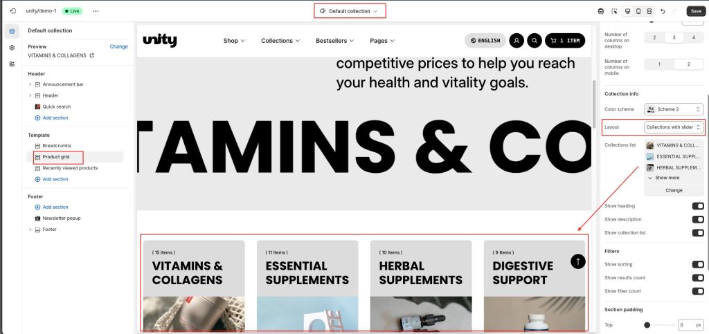 Add collections to the Collections list to display a row of collections below the scrolling collection.