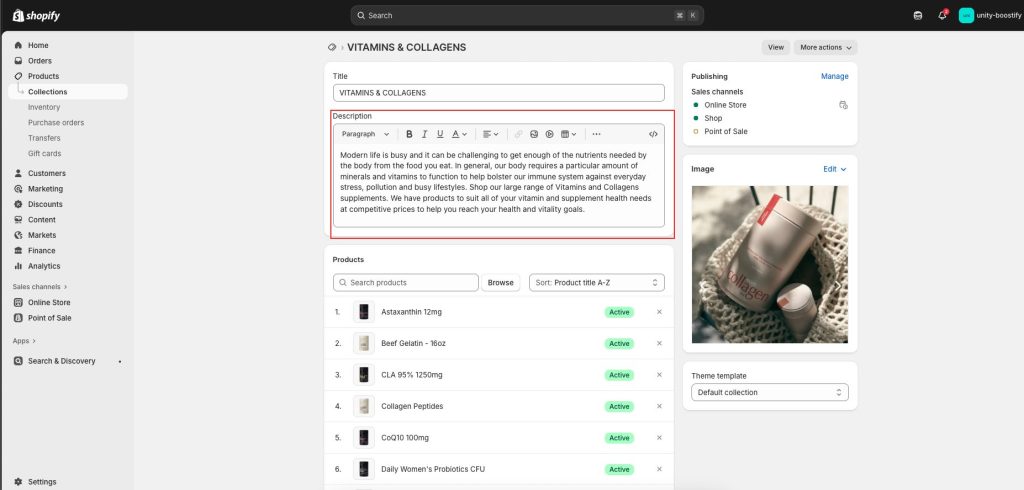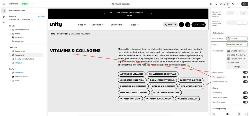 Dynamic active Show heading/ Show description/ Show collection list in this layout.